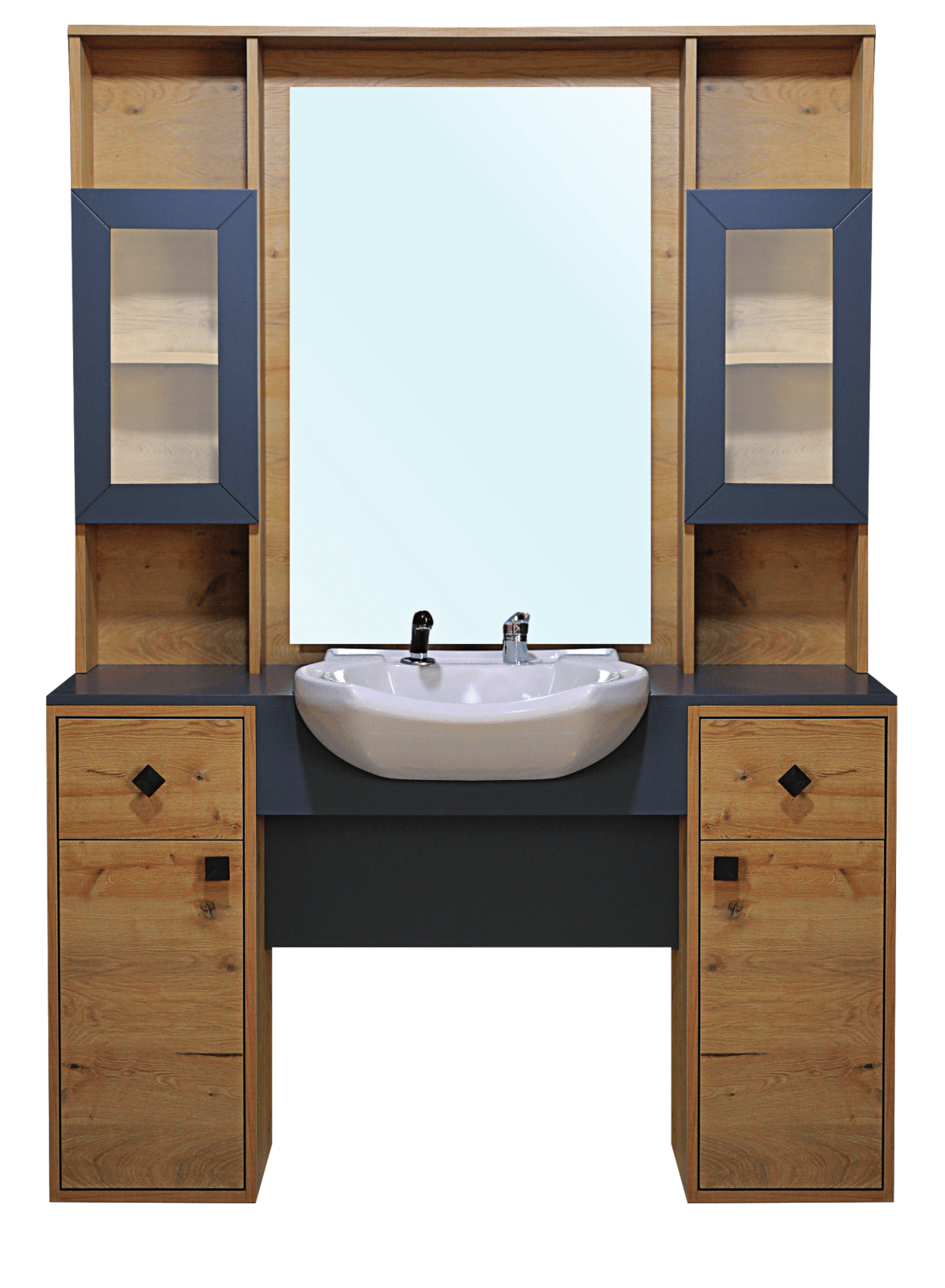 Spacious storage and subtle tones against natural wood gives a stylish look. This unit comes fully finished in three sections for easy installation.